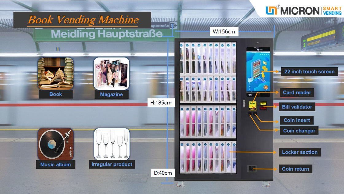पुस्तकें वेंडिंग मशीन, कस्टम आकार की वेंडिंग मशीन, हमारी मशीनें वाईफाई या 4जी नेटवर्क द्वारा इंटरनेट से जुड़ी हैं। हम स्क्रीन और इंटरनेट का उपयोग करने के लिए सॉफ्टवेयर विकसित करते हैं। यही कारण है कि विक्रेता दूर से इन्वेंटरी की निगरानी कर सकते हैं, पीसी या मोबाइल से विज्ञापन अपलोड कर सकते हैं, यहां तक कि कहीं भी, कभी भी मशीनों की एलईडी लाइट/तापमान को भी नियंत्रित कर सकते हैं।